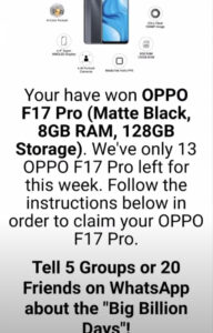 ആമസോൺ ബിഗ് ബില്യൺ ടെ എന്ന തരത്തിൽ ഒരു മെസേജ് വാട്ട്സ്ആപ്പ് ഉപയോഗിക്കുന്ന നല്ലൊരു ശതമാനം ആളുകൾക്കും ലഭിച്ചിട്ടുണ്ടാകും.ഈ മെസേജിനൊപ്പം ഒരു ലിങ്കും ഉണ്ടാകും.ങ്ക് തുറന്നാൽ കുറഞ്ഞ തുകക്ക് സാധനങ്ങൾ വാങ്ങാനായി സാധിക്കും എന്നാകും അതിൽ പറഞ്ഞിട്ടുണ്ടാകുക.ലിങ്ക് തുറന്നാൽ സൗജന്യമായി ഒരു സ്പിൻ ലഭിക്കും എന്നും,സ്പിൻ ചെയ്യുമ്പോൾ ലഭിക്കുന്ന വസ്തു അത് ചെയ്യുന്ന ഉപഭോക്താവിന് ലഭിക്കും എന്നുമാകും പറയുകഇത്തരത്തിൽ സ്പിൻ ചെയ്താൽ അതിൽ ഒരു ഗിഫ്റ് നമുക്ക് നമുക്ക് ലഭിച്ചു എന്ന തരത്തിൽ ഒരു അറിയിപ്പ് വരുന്നതും നമുക്ക് കാണാൻ സാധിക്കും.വരുന്ന ഓപ്ഷനിൽ OK കൊടുത്ത് കഴിഞ്ഞാൽ അടുത്താക്കി വിൻഡോയിൽ ഈ സമ്മാനം ലഭിക്കാനായി ബിഗ് ബില്യൺ ഡെയ്സിനെ പാട്ടി 5 പേരെ അറിയിക്കാൻ ഷെയർ ചെയ്യാൻ ആവശ്യപ്പെടുന്ന വിൻഡോയിൽ എത്തുന്നതാണ് .